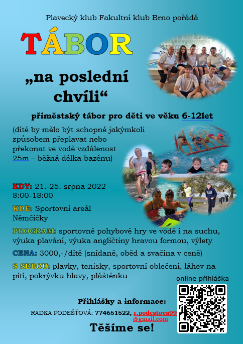 Plavci z Fakultního klub Brno zvou děti ve věku 6-12 let na příměstský TÁBOR „na poslední chvíli“. Dítě by mělo být schopné jakýmkoli způsobem přeplavat nebo překonat ve vodě vzdálenost 25 m - běžná délka bazénu.