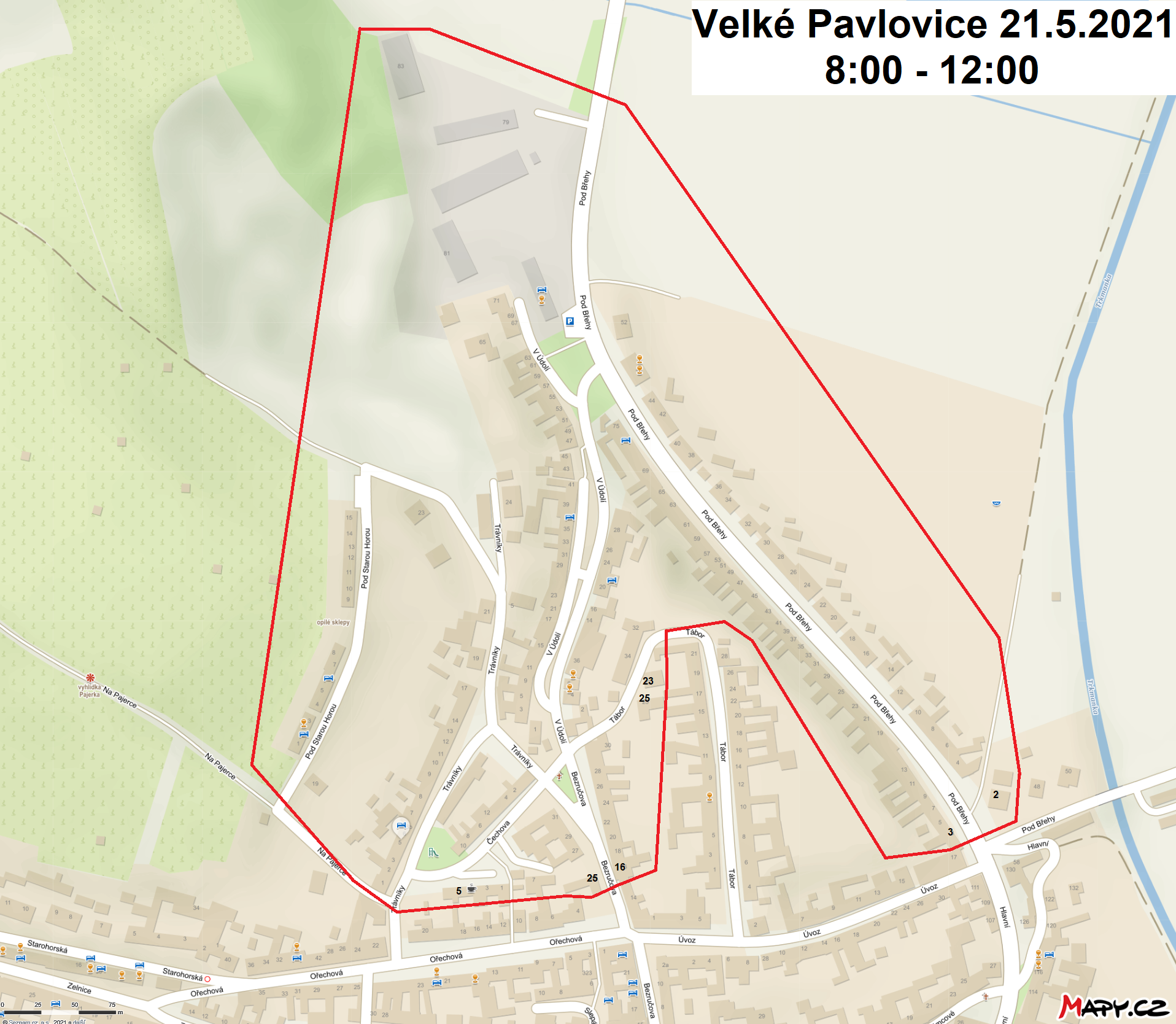 Trafostanice Velké Pavlovice POD BŘEHY (700384) část ul. Pod Břehy od č.p.627/2 a 215/3 po č.p.1011/52 a 1147/83 Celá ul. V Údolí, Trávníky, Čechova a Pod Starou Horou část ul. Tábor č.p.232/25, 1145/23, 346/34 a 577/32 část ul. Bezručova od č.p.398/16 a 214/25 po č.p.112/30 a 1180/33